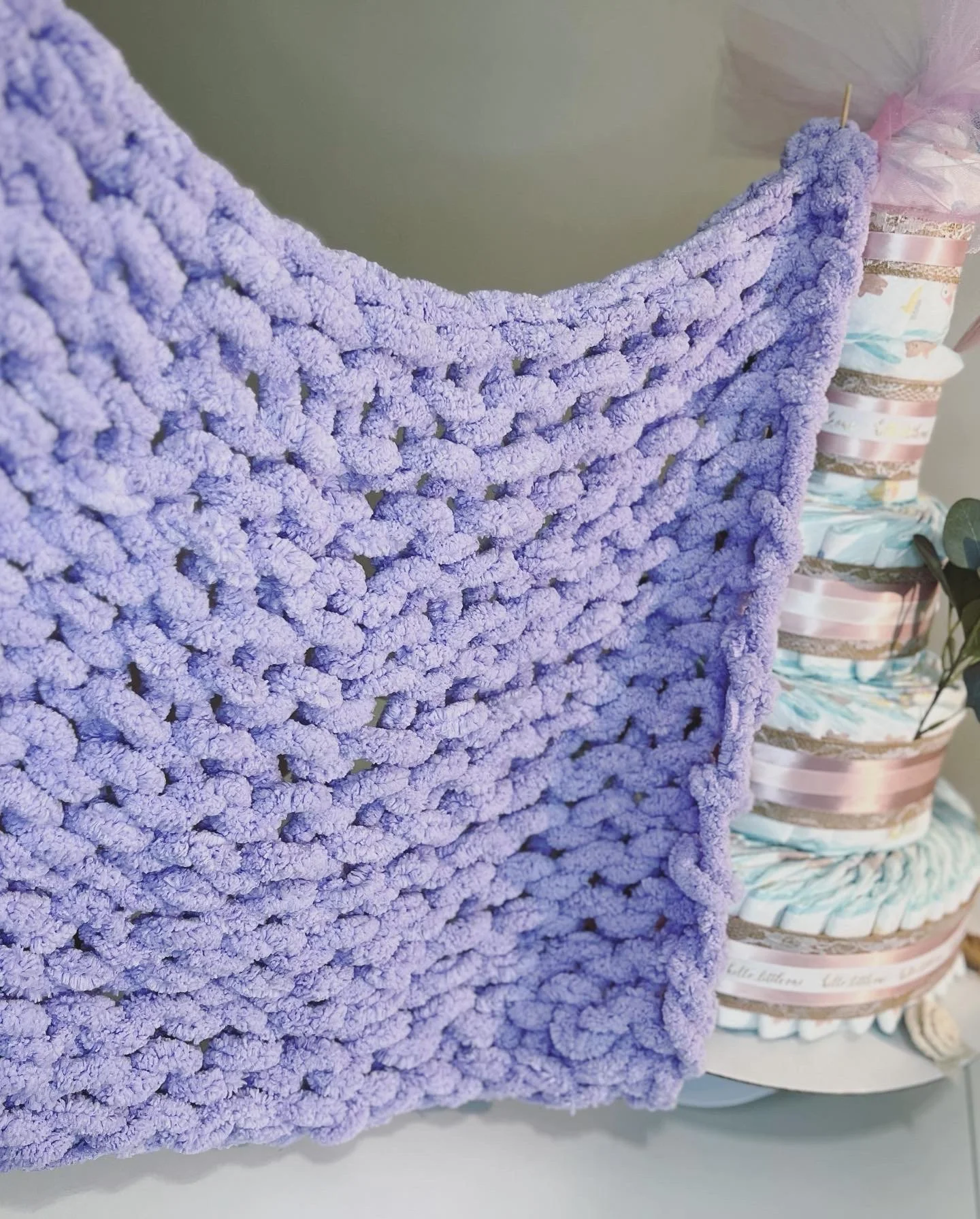 Materials 100% Cotton Cloth wrapped design of choice starting with 55 Pampers diapers size 1 inside or more. Can design to preference or any theme. (Pictured design has Pampers 80 diapers with pampas feathers, ribbons, deco details. Can customize to add baby items. Chunky Baby blanket not included but may order separately.